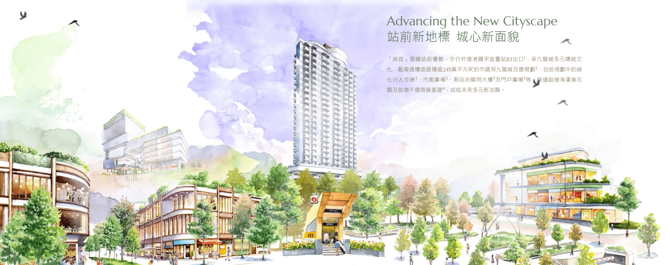 「南首」傲擁站前優勢,步行秒達港鐵宋皇臺站B3出口,承九龍城多元傳統文化,毗鄰總樓面面積逾245萬平方呎的市建局九龍城百億規劃2,包括規劃中的綠化行人步道、市集廣場、新政府聯用大樓及門戶廣場等,接通啟德海濱後花園及啟德千億商貿基建,成就未來多元新活圈。